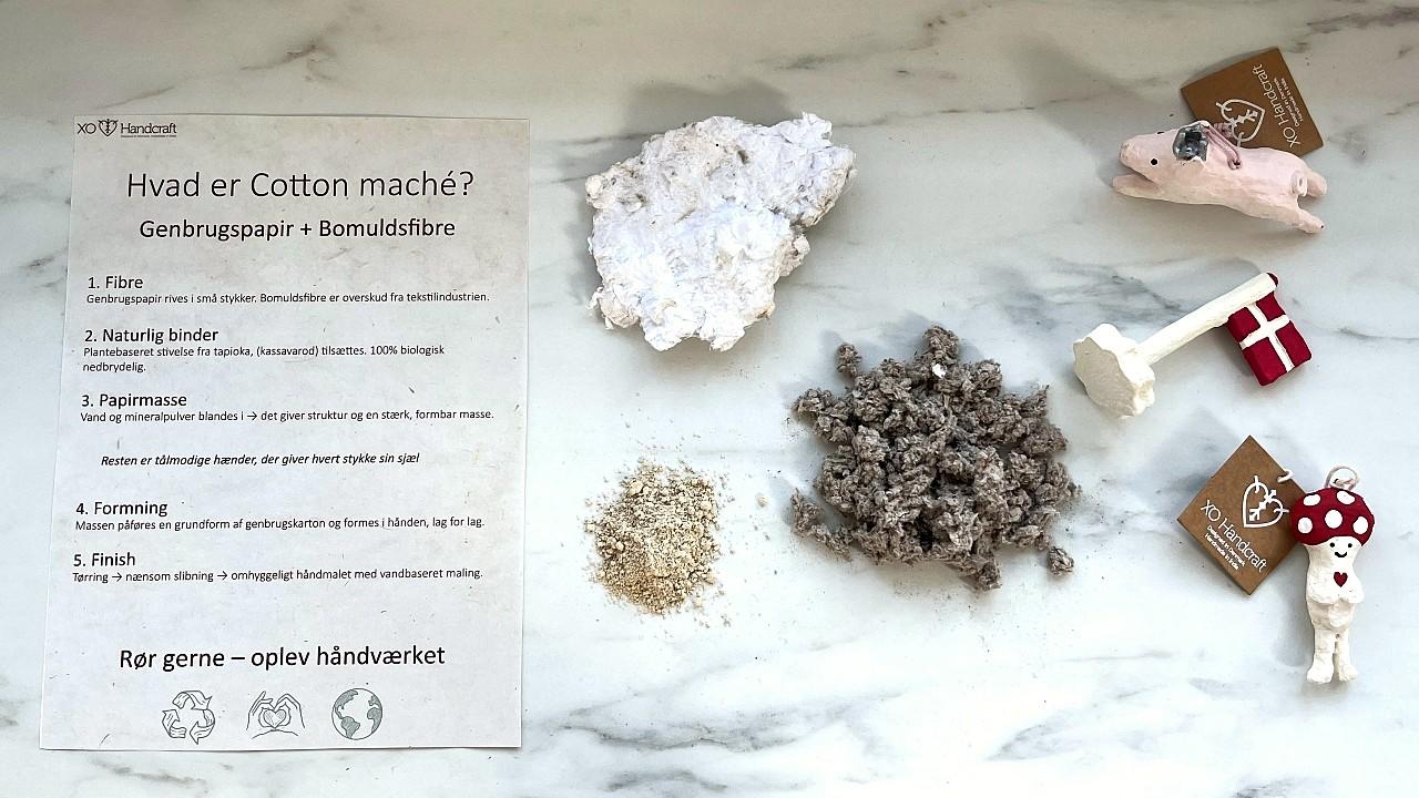 arrow_backTil oversigtenKom og oplev materialerne bag XO Handcrafts håndlavede ornamenter – genbrugspapir, genanvendt bomuld, mineralpulver og naturlig stivelse.