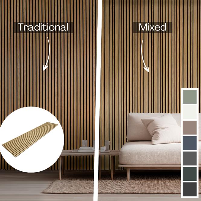 1. Bryd mønsteret i lamellerne: Ved at lave variation i lamellernes bredde, dybde eller afstand kan man skabe en mere dynamisk og naturlig overflade. En uregelmæssig rytme bryder med den ensformighed, der ofte ligger fører til den optiske træthed – et eksempel på dette kunne være vores Forrest Mixed paneler med ege-finér, hvor du stadig får den smukke træoverflade, men det brudte mønster skaber en ro for øjet.