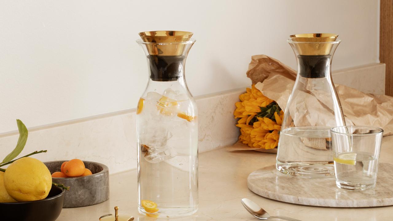 Med mere end 2 mio. solgte vandkarafler er det prisvindende drypfrie design fra Eva Solo blevet en del af hverdagslivet hos mange familier. Karaflerne, der fås i to forskellige organiske former, lanceres nu med krave og vippelåg i et elegant messing-look, der matcher mange hjem i dag.