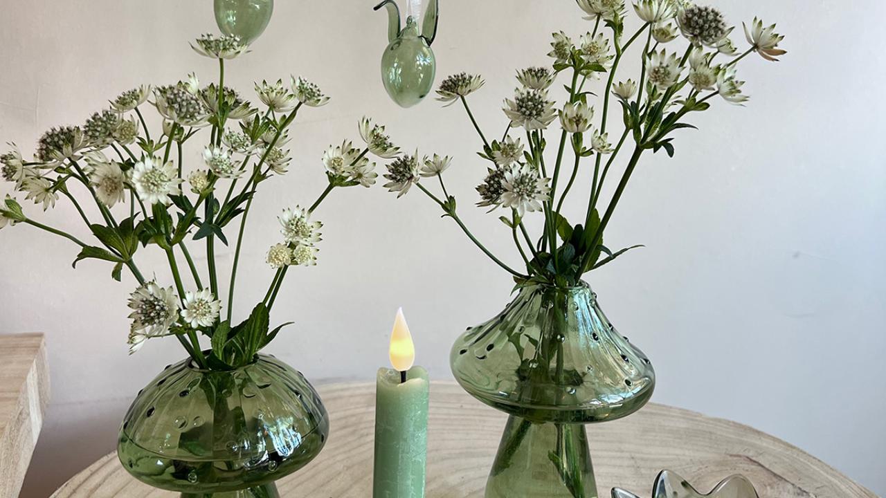 Glas i alle regnbuens farver. Brug dem tone-i-tone eller giv den gas med alle farver. De små mushroom vaser er anvendelige på mange måder og sammen med skåle og stager skaber de den helt rette stemning.