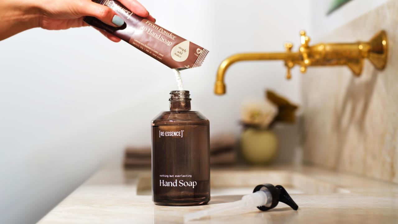 "Med en smuk genanvendelig glasflaske, velduftende håndsæber og omsorg for naturen vil [RE·ESSENCE] gøre op med unødvendige CO2-syndere".