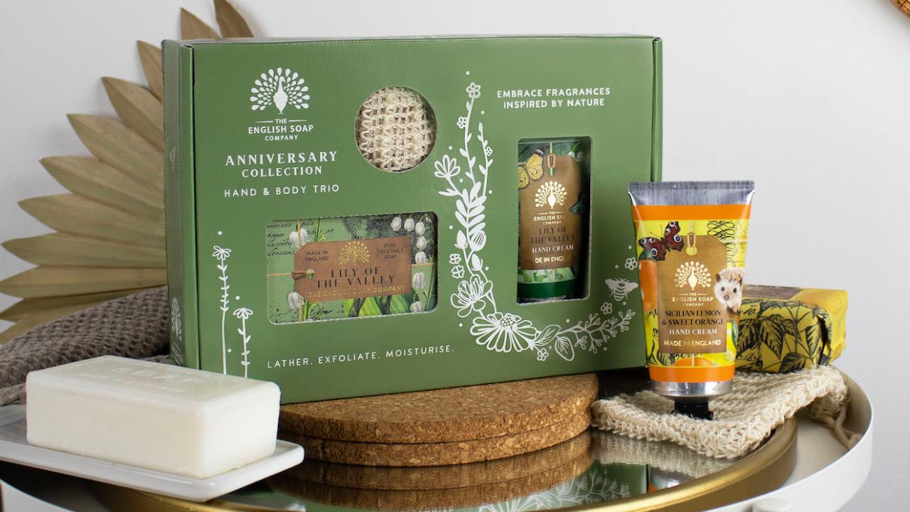 The English Soap Company helt nye Hand & Body Trio gaveæske fra deres Anniversary Collection. Dette smukt sammensatte sæt inkluderer en luksuriøs sæbebar, håndcreme og sæbebesparende pose. Rens, nær og beskyt med denne forkælende trio, inspireret af naturen og Sussex-landskabet.
