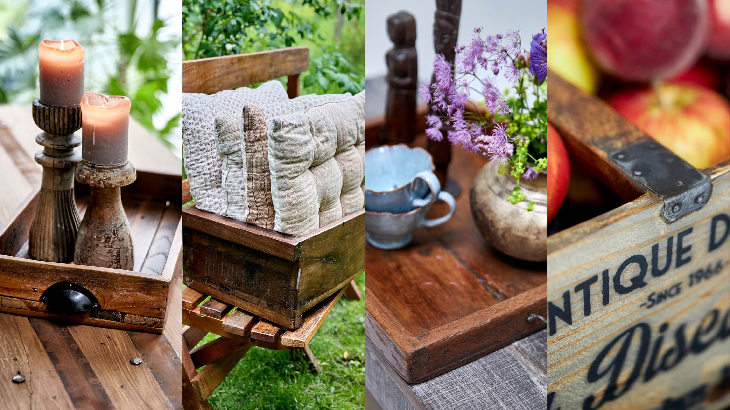 Gamle trækasser og bakker er fantastiske til at fremhæve dine yndlingsting og skabe visuelle stilleben i hjemmet. De tilfører en naturlig varme og en følelse af historie, som giver atmosfære og karakter – uanset om de står på spisebordet, i entréen eller på badeværelset.