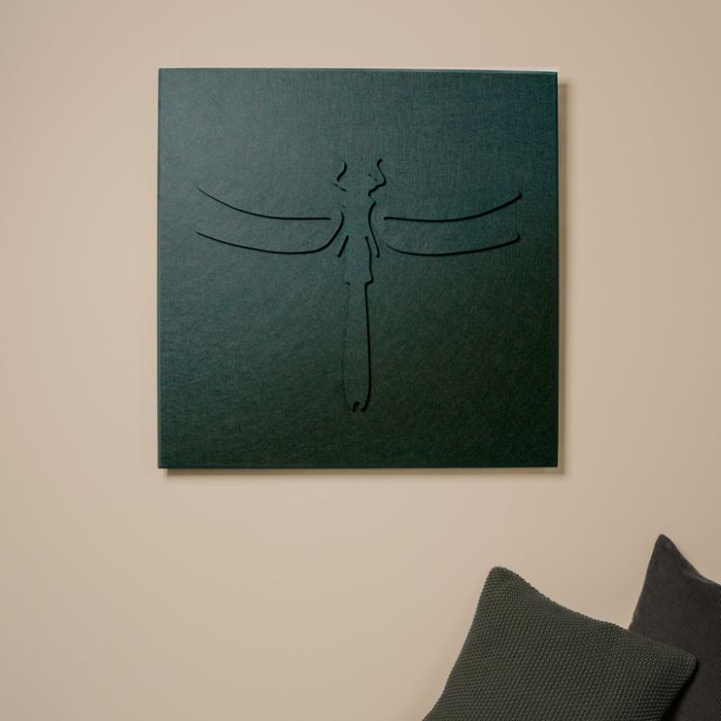 arrow_backTil oversigtenKvadratisk akustikpanel med dybgrønt guldsmedmotiv som er monteret på en ligeledes dybgrøn baggrund. Panelet er designet i to lag 9 mm akustisk dæmpende filt som er fremstillet af 75 % genanvendt plast. Det er nemt at sætte op med det medfølgende ophæng.
