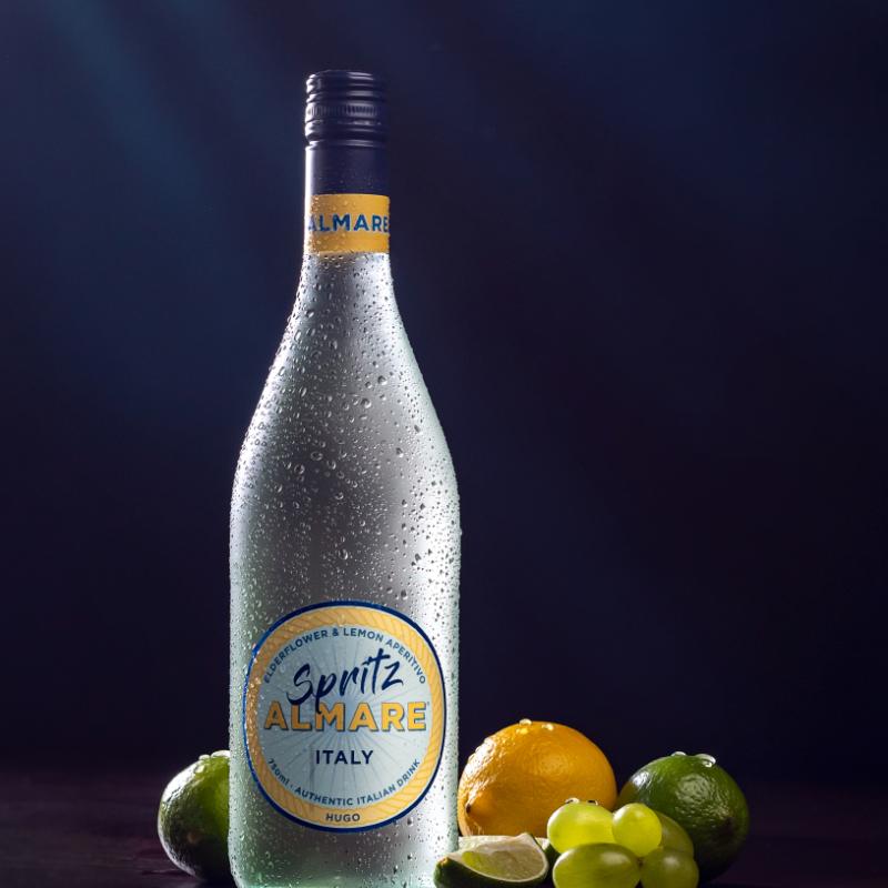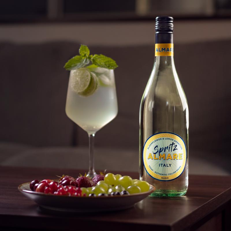 Almare Hugo spritz er klar til at drikke direkte fra flasken, hvilket gør den praktisk og nem at nyde til enhver lejlighed.