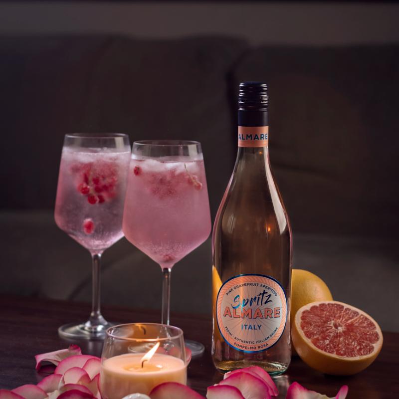 Almare Rosa spritz serveres over is i et vinglas eller en stor tumbler og kan pyntes med en skive pink grapefrugt for at fremhæve dens friske citrusnoter.