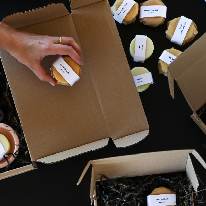 En pakke med: shampoo bar, balsam bar, sæbe bar, bøtte til sæber, loofah svamp