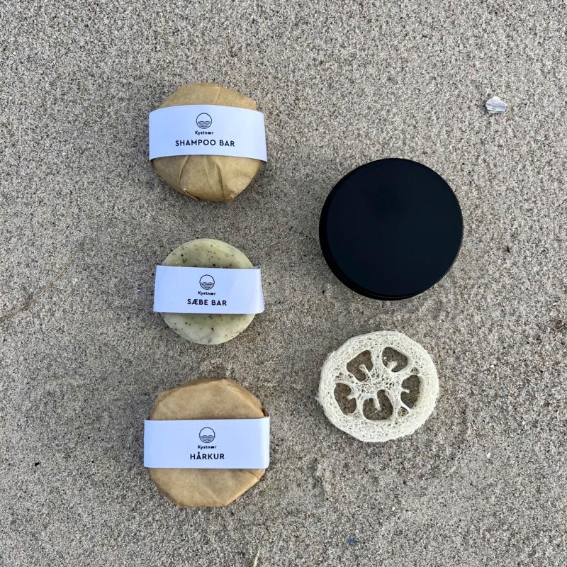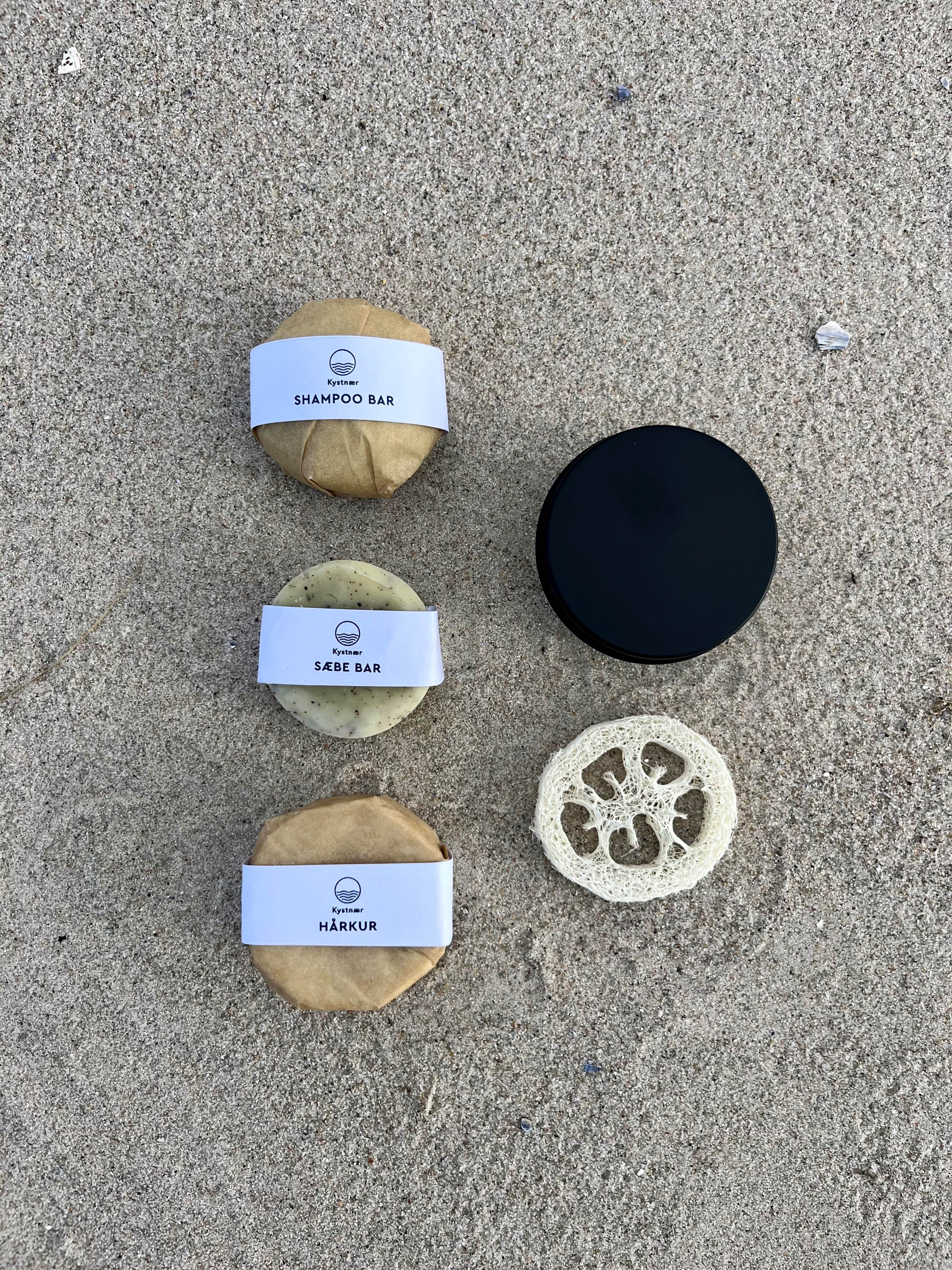 Pakken indeholder: shampoo bar, hårkur, sæbe bar, rejsebeholder og en loofah svamp.
