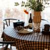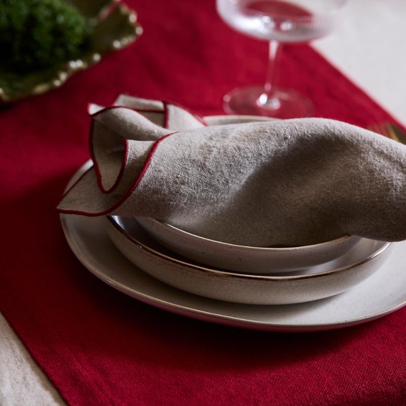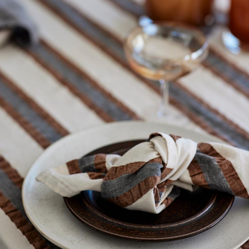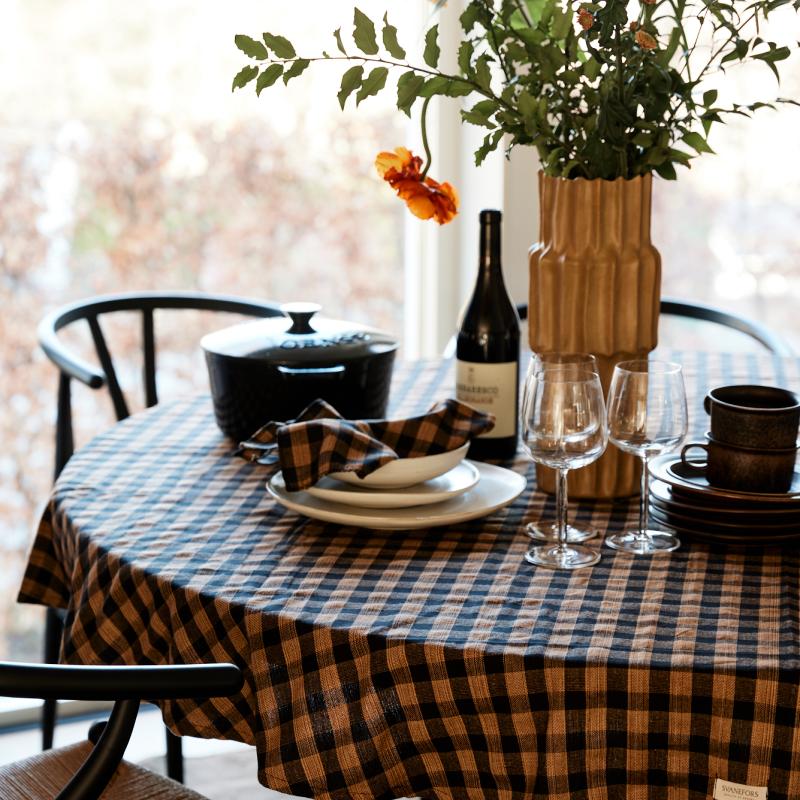 Sabina i ny størrelse Ø200 samt Ava Ø160. Sabina er lavet af hør og bomuld og vævningen med chambray effekt. Ava er 100% bomuld og sort og brun ternet. Munderservietter fås i begge tekstiler.