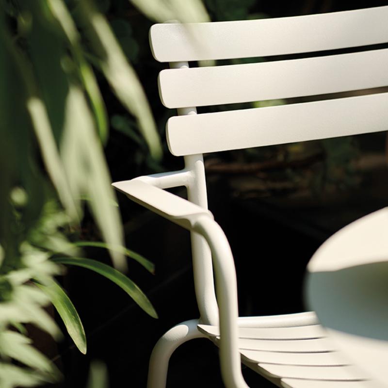 arrow_backTil oversigtenALUA is a versatile aluminum dining chair, designed for numerous different environments, whether it’s a private balcony, a public park, or a restaurant.