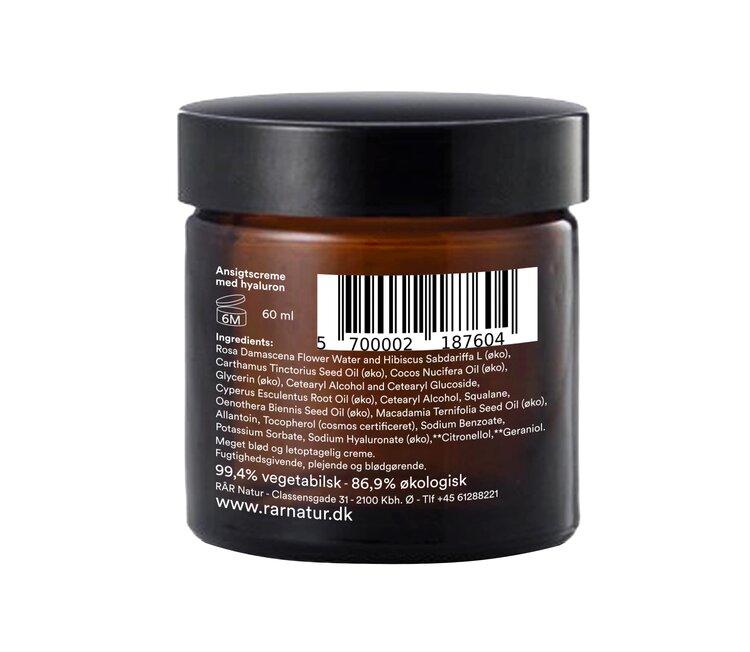 RÂR Natur Ansigtscreme har et højt indhold af hyaluronsyre. Den er meget blød og let optagelig og den kan bruges både som dagcreme og natcreme. Den er fugtgivende, fyldt med antioxidanter, hudplejende vitaminer og fedtstoffer.