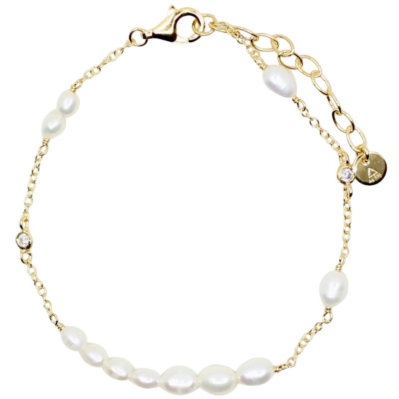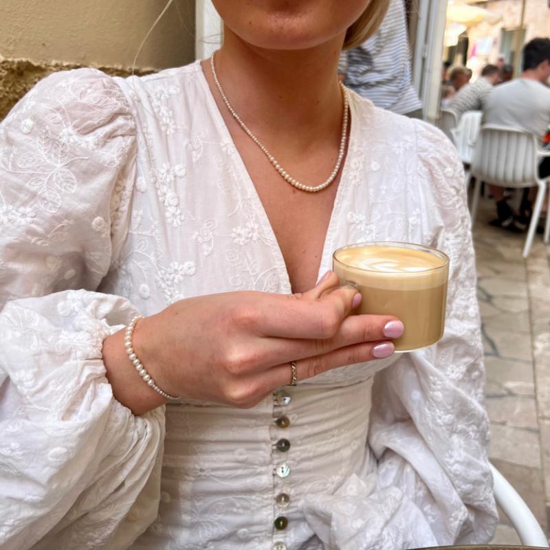 arrow_backTil oversigtenArmbåndet er fremstillet af ferskvandsperler i 3 - 4 mm og genanvendt 18K forgyldt 925s med 2 micron guldbelægning / snorelukning.