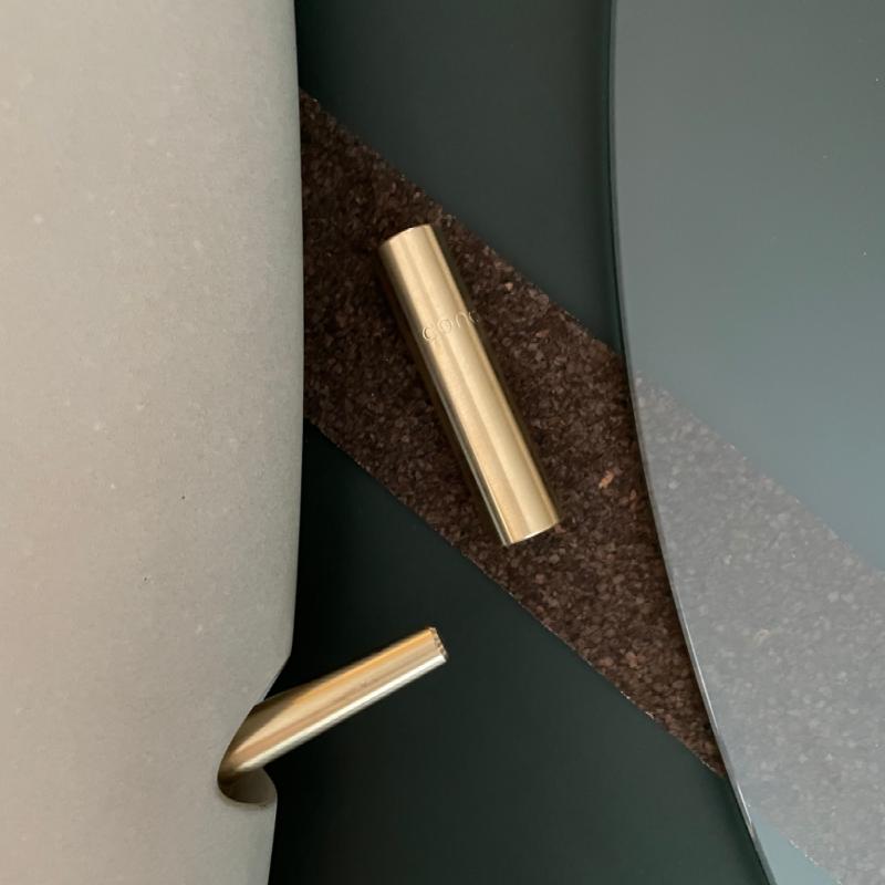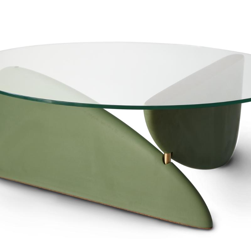 Lounge bordet kommer i 6 naturlige farver, nøje afstemt, glaspladen svæver let på de 2 halve "sten", der samles med messing stav, som fuldender udtrykket. Silkebeton er et relativt nyt materiale indenfor dansk møbeldesign, og tilmed også bæredygtigt.
