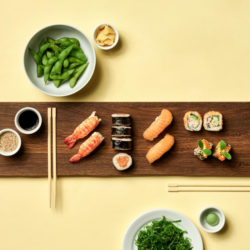 Servér japanske retter, der kræver nøje forberedelser og respekt for naturlige smage på egebræt fra by Brorson.