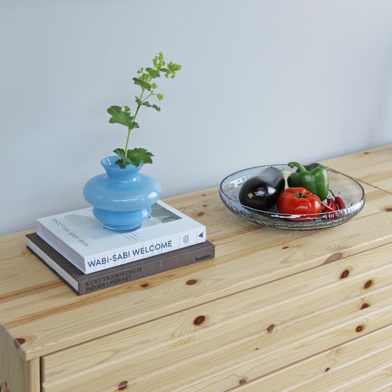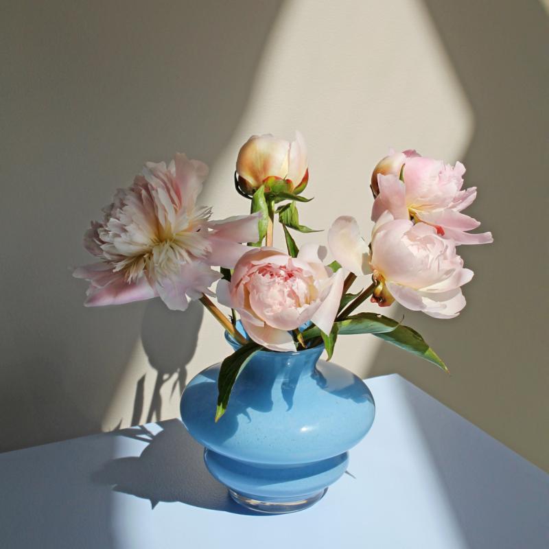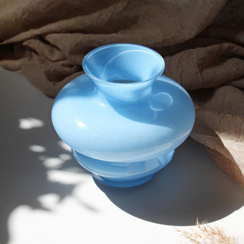 arrow_backTil oversigtenPetit lyseblå glasvase i blødt, organisk formsprog. Med sin kurvede form og smalle, runde åbning er vasen det perfekte valg for mindre buketter. Den petite størrelse gør vasen perfekt som del af en fin borddækning eller som dekorativt objekt i vindueskarmen. Den lyseblå glaseffekt er yderst betagende og gør den mundblæste vase ekstra iøjenfaldende. Mål: Ø14,5 x H12,5 cm