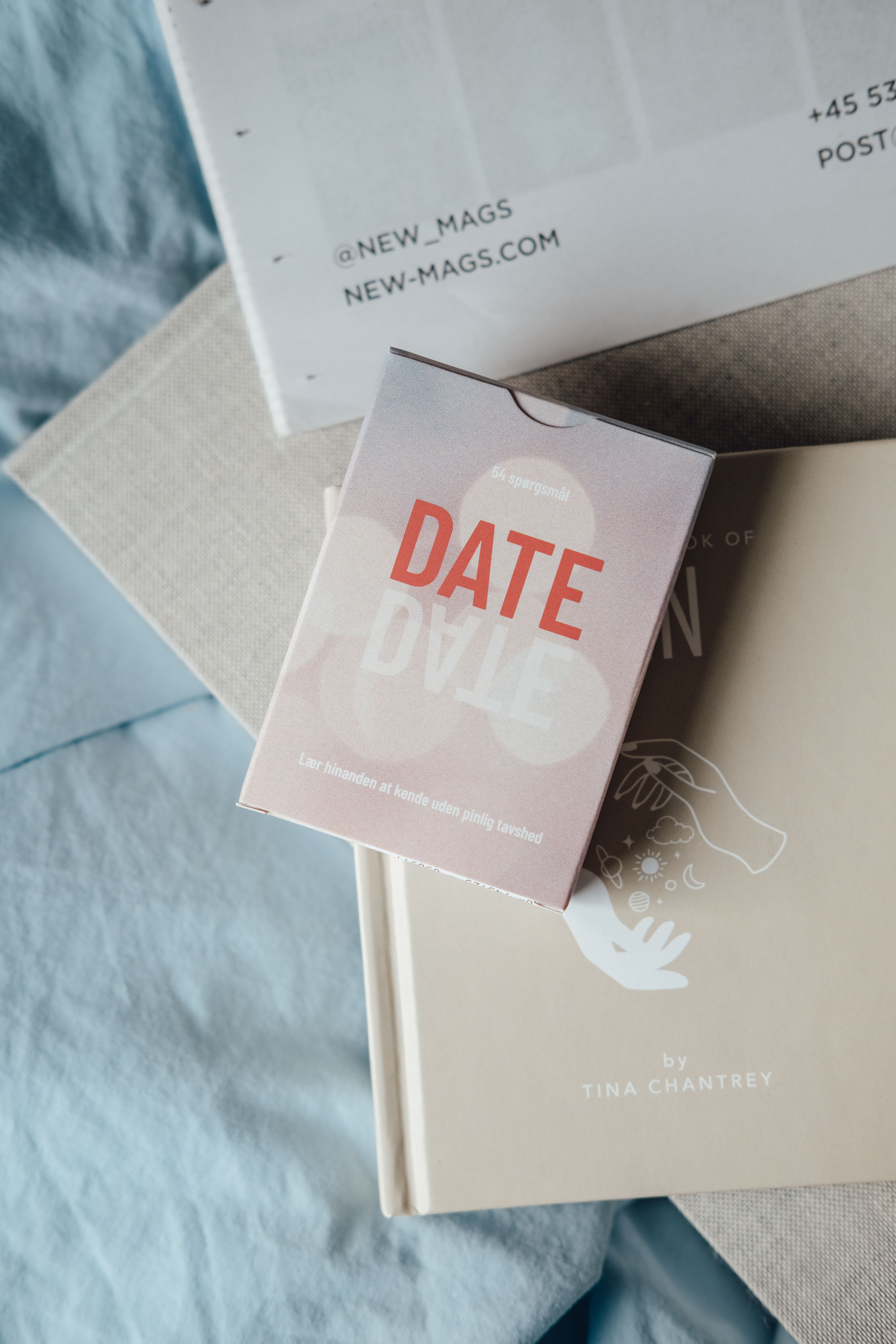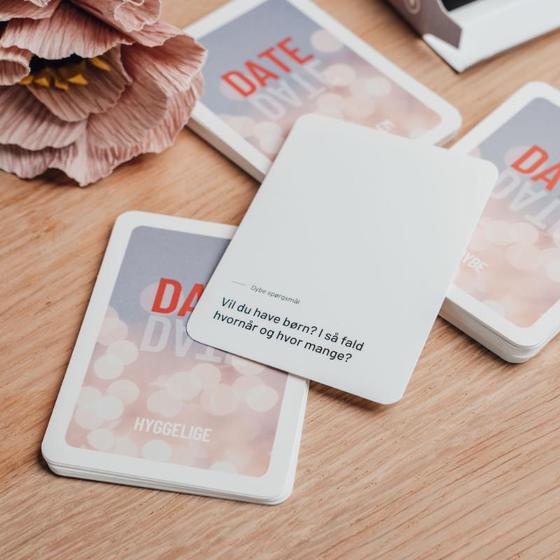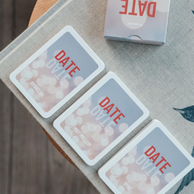 DATE er et sæt samtalekort til at få den gode samtale godt i gang fra start. På den måde kan i lære hinanden at kende uden pinlig tavshed og sammen undersøge om der er nogen gnist. Stil hinanden spørgsmål som: Hvornår sang du sidst for dig selv? Hvad gjorde dig glad som barn? Hvad sætter du mest pris på at være i et forhold?