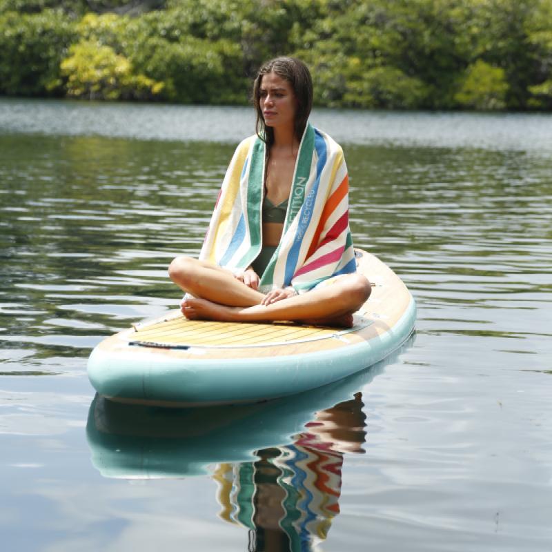 Et badehåndklæde i regnbuefarver, som er lavet i 100% genanvendeligt materiale. Delmor Fit VIVA badehåndklæde findes i 76x142cm. Det er fremstillet i 70% recycled bomuld, taget fra t-shirt rester - og 30% er fra plastikflasker. Det har en helt igennem effektivt sugeevne, tørreevne og sikre et bæredygtigt valg på stranden eller i hjemmet.