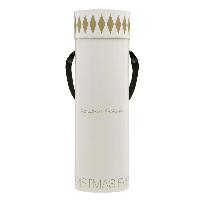 "Hatteæske" med låg og håndtag af silkebånd som julekalenderen opbevareres i, er udført af genanvendelig materialer.