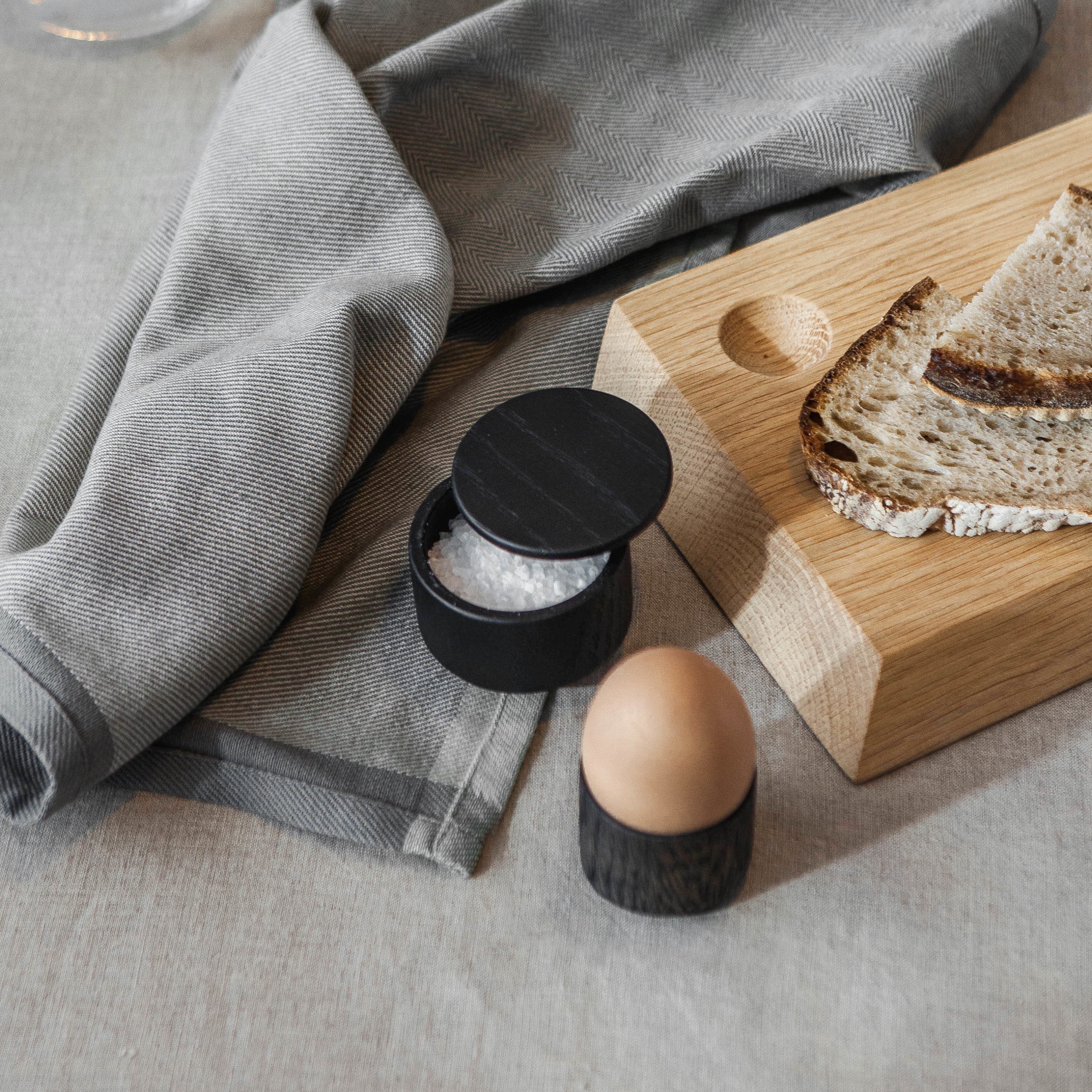 Egg Me er i familie med kværnen Crush Me og saltkarret Salt Me. Fås som 2-pak i farverne Nature, Oiled, Smoked og Black.