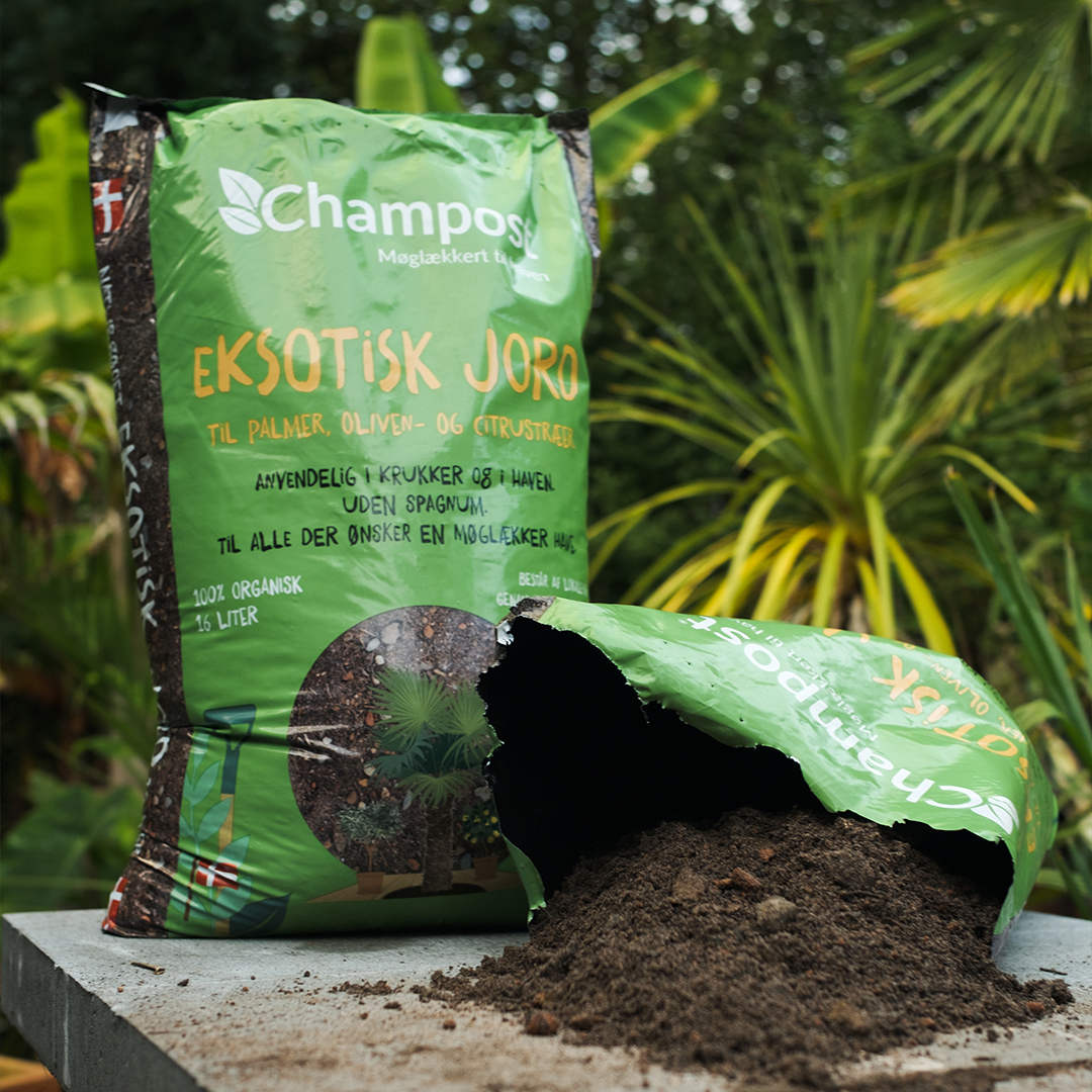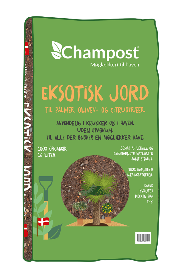 arrow_backTil oversigtenChampost Eksotisk Jord er specialudviklet til at give dine palmer, oliventræer, citrustræer og lign. de bedste betingelser for at trives under nordiske forhold. Jorden er velegnet til alle eksotiske planter, uanset om de er plantet direkte i jorden eller i krukker, og så er den helt fri for spagnum.