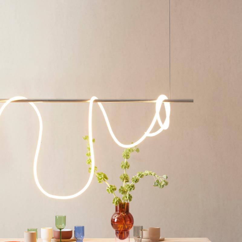 Lampen er funktionel og fleksibel, da den kan benyttes på mange måder. Den kan eksempelvis bruges som væglampe, bordlampe eller loftlampe. Skab et personligt, unikt mønster på væggen ved at bruge de medfølgende ophæng og lad lampen smyge sig i organiske og naturlige bevægelser. Den kan også draperes i bølgende bevægelser over et rør, som hænger vandret ned fra loftet, eksempelvis over et langt spisebord. Du kan også folde den rundt om sig selv og placere den på en stol, en reol eller hylde for at skabe en lysende skulptur.