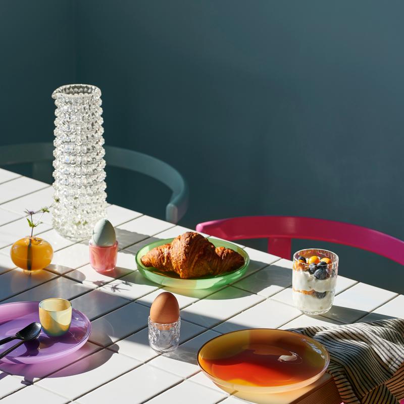 The plates are all hand blown by individual glass blowers who put their very own artistic touch on the specific plate. It makes every single plate a unique piece of art. Our Flow Plate is made of three layers of glass, as a combination of clear, stripes and coloured glass.