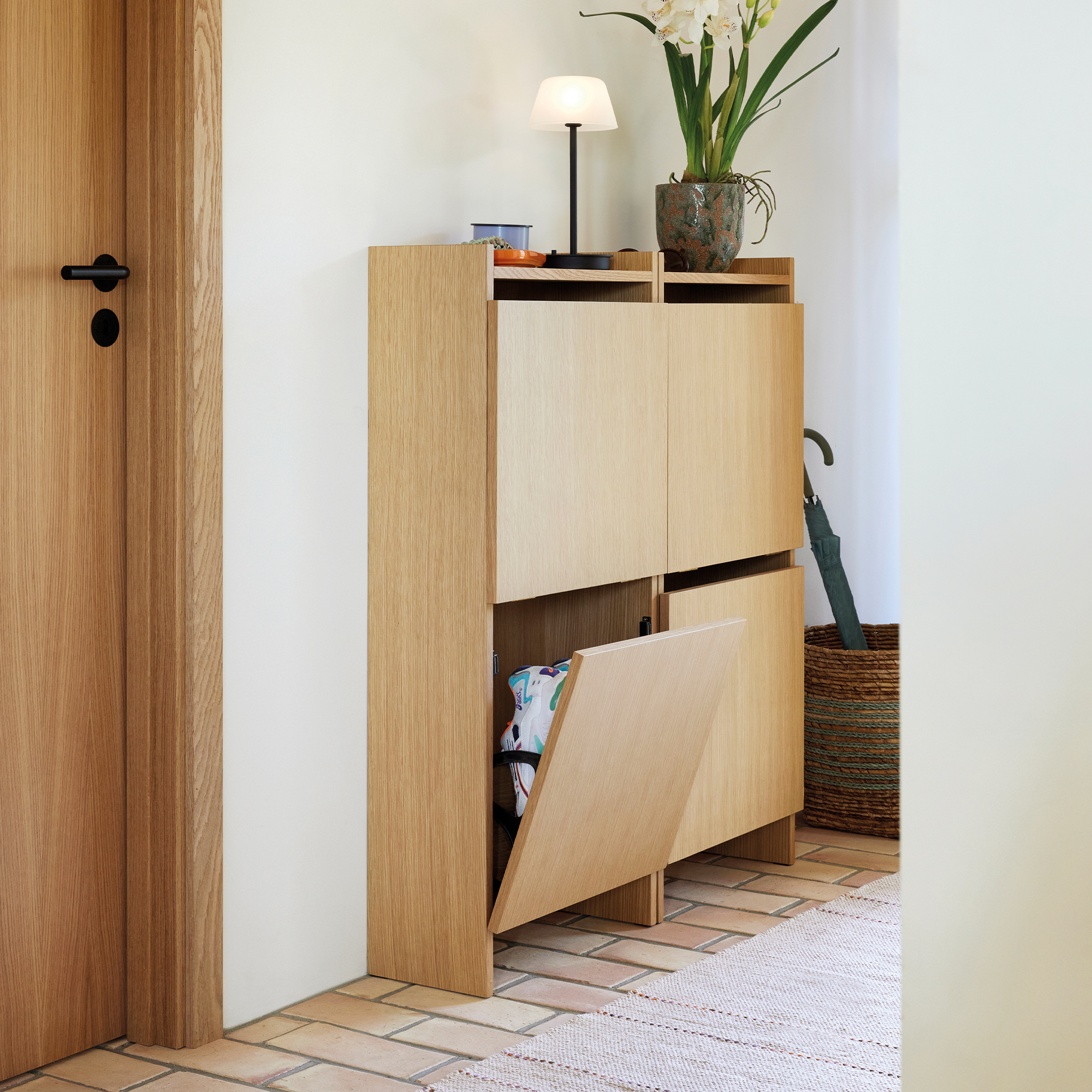 arrow_backTil oversigtenMød det nyeste medlem af Forma-familien - Forma Skoskab. Designet er både funktionelt og æstetisk tiltalende med to-lags opbevaring af sko, ideelt til mindre entréer. Dette stilrene skoskab er lavet af FSC-certificeret træ, og bidrager til et elegant udtryk i dit hjem. Hvis du har en stor skosamling, kan du nemt kombinere to skabe for at øge opbevaringskapaciteten. Det minimalistiske design sikrer, at dine sko er organiseret og dit hjem ser ryddeligt ud.