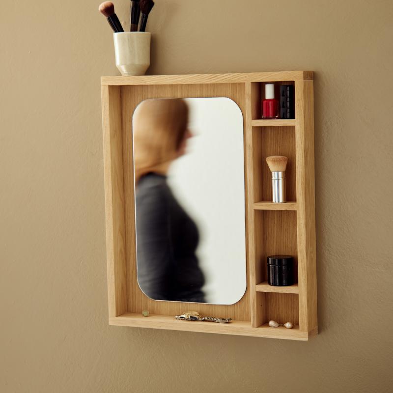 arrow_backTil oversigtenGlance Mirror er et stilfuldt og funktionelt møbel, der kombinerer spejl og hylde i ét design, der forener nostalgi og elegance. Glance Mirror er fremstillet i massivt egetræ, og de små hylder tilbyder en simpel løsning til opbevaring af nøgler, smykker eller plejeprodukter. Inspireret af det ikoniske spejldesign fra 1970’erne, kombinerer det et klassisk udtryk med moderne funktionalitet. Spejlet er designet med rene linjer i et charmerende design, der tilføjer en retro-stemning til din indretning. Glance Mirror kan monteres på væggen på flere måder, hvilket giver mulighed for at placere hylderne ved siden af, over eller under spejlet.