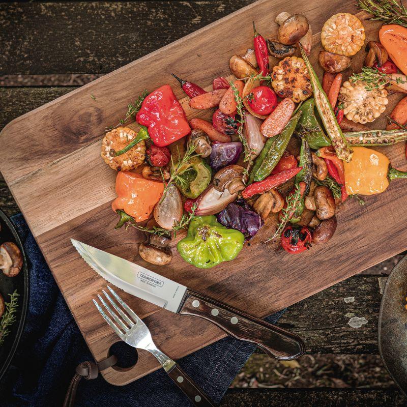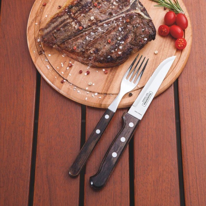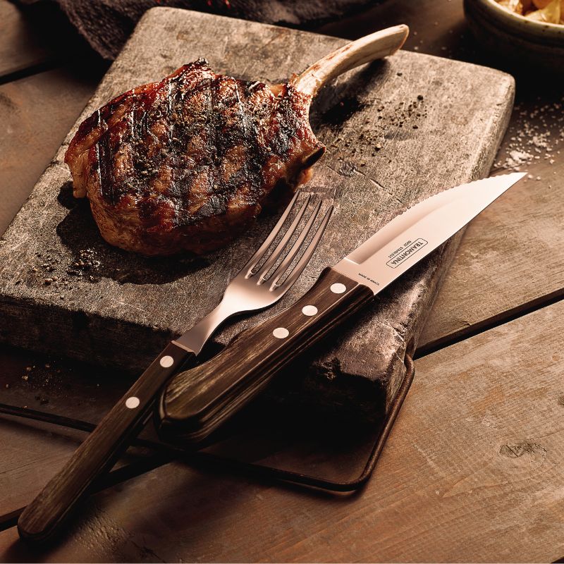 arrow_backTil oversigtenGrill / Steaksæt med 2 skarpe Jumbo-steakknive og 2 Jumbo-gafler fra Tramontina er fremstillet i et unik og gennemtænkt design. Grebet på bestikket ligger godt i hånden, og giver dig den ultimative vinkel at skære grillkødet og steaks.