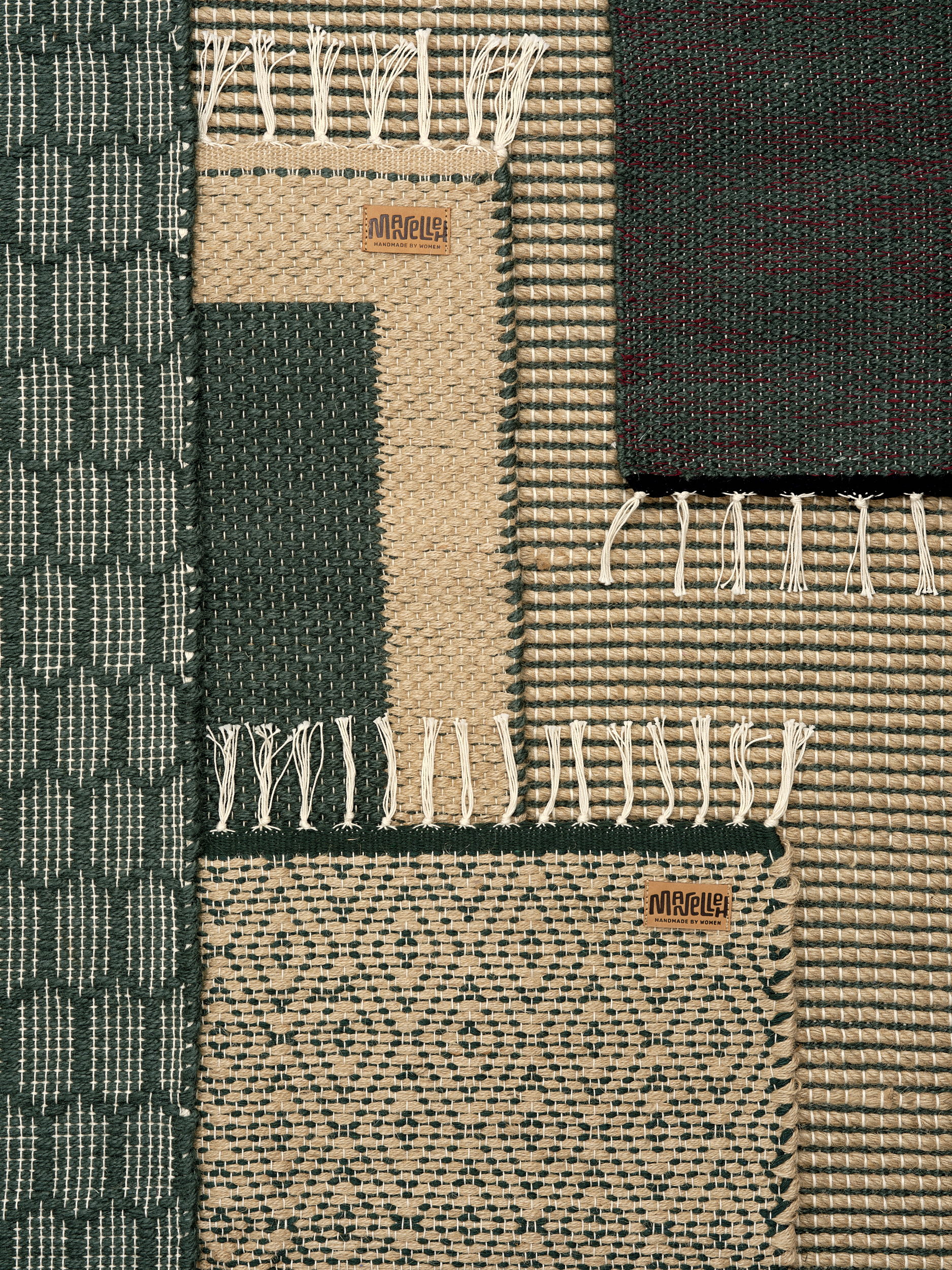 Gulvtæpper, løbere og dørmåtter hos Manelleh. Findes produceret i jute, sari eller overskuds t-shirts.