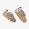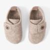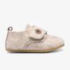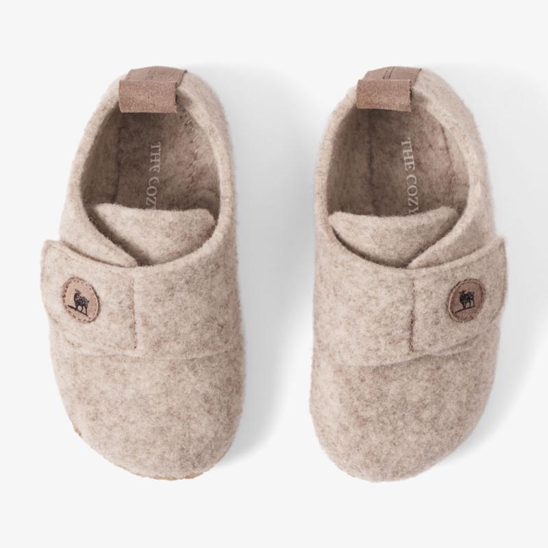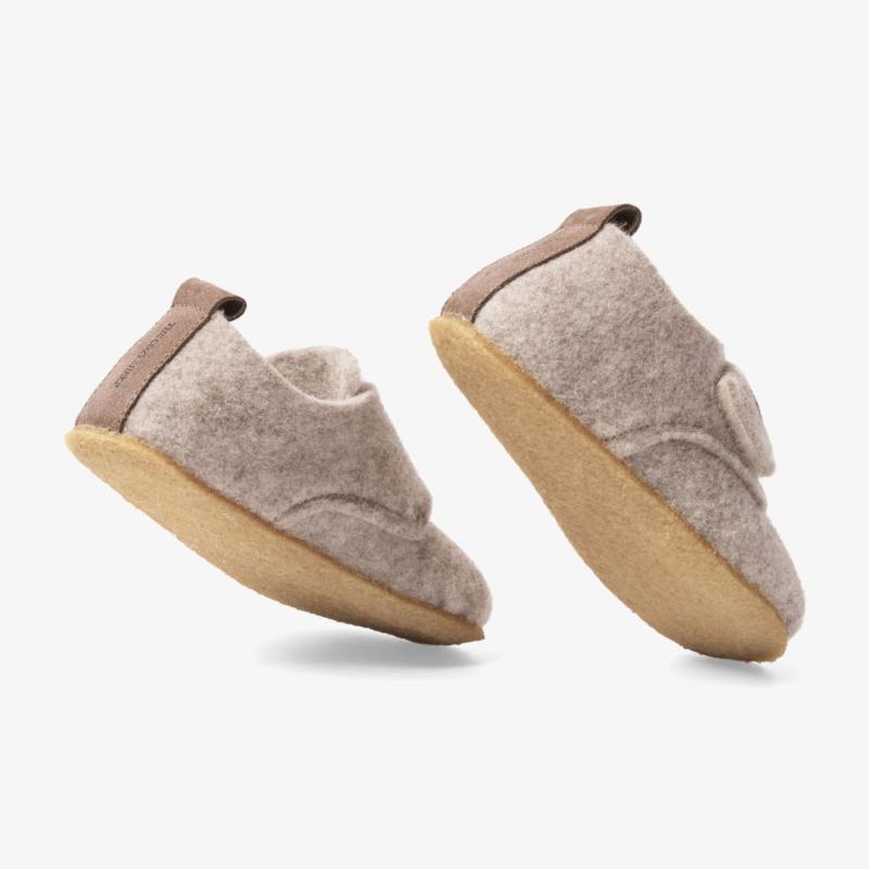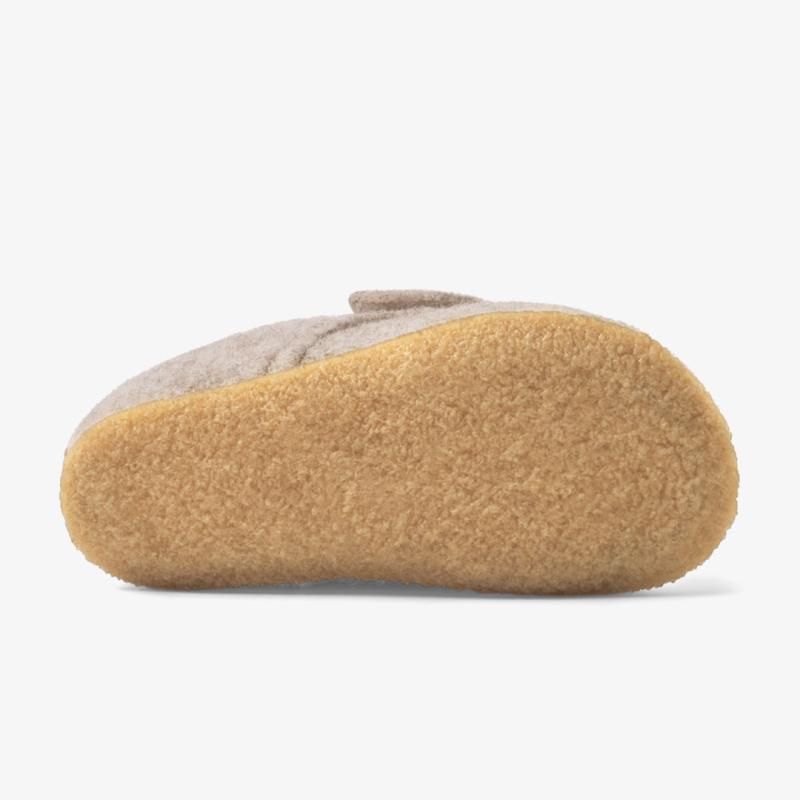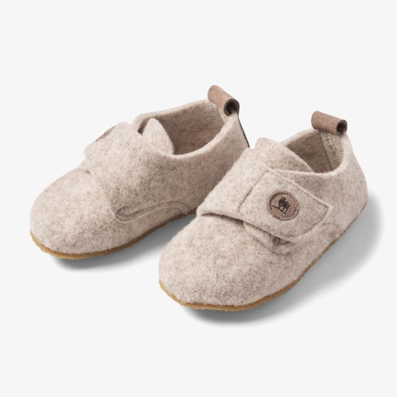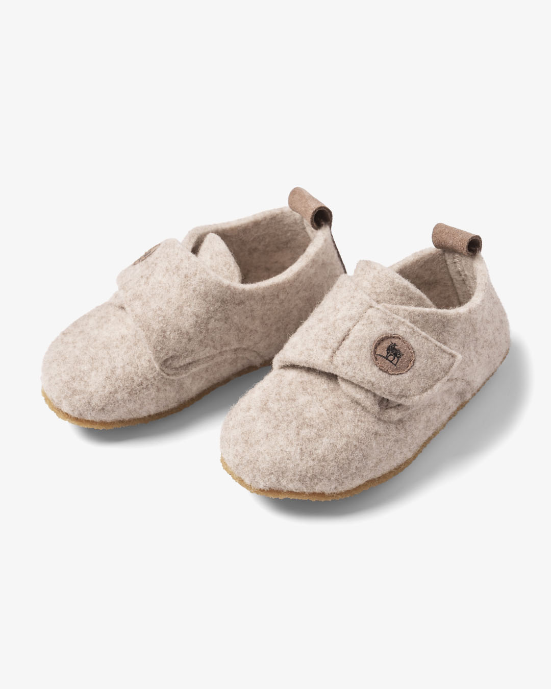 Der er skruet helt op for både komfort og kvalitet med vores børnehjemmesko, lavet af OEKO-TEX certificeret uldfilt. Hjemmeskoene fås i str. 22-35 og er helt normale i både størrelsen og bredden. Hjemmeskoene er perfekte til aktive børn, da de har en meget fleksibel og skridsikker crepe-sål, som gør, at børnene står godt fast, uanset hvor de leger. Skoene har en faconsyet hælkappe, der giver et godt greb om anklen og sikrer at hjemmeskoen sidder godt fast om barnets fod. Hjemmeskoene er desuden forsynet med en justerbar velcrostrop, og kan åbnes meget op, så det er nemt at få barnets fod i og ud af skoene.