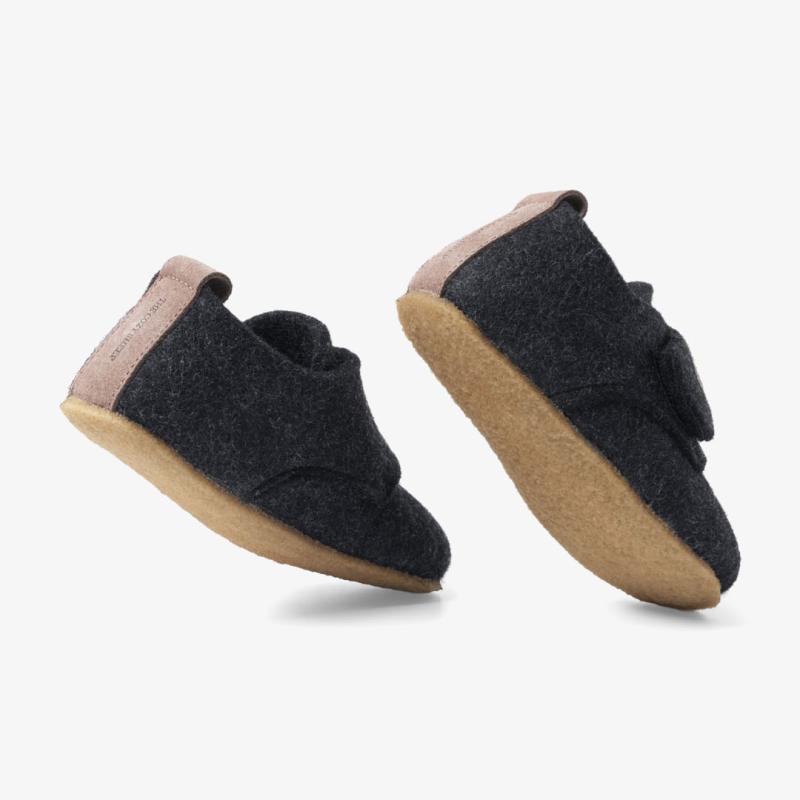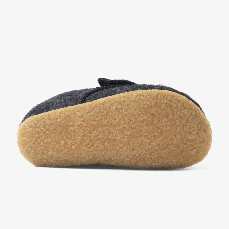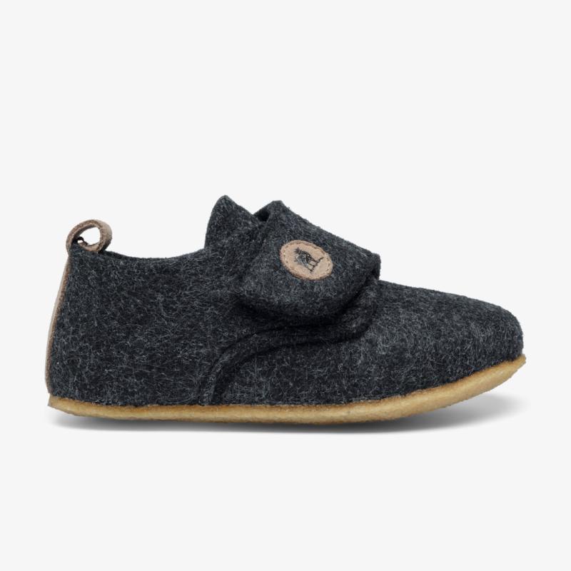 Der er skruet helt op for både komfort og kvalitet med vores børnehjemmesko, lavet af OEKO-TEX certificeret uldfilt. Hjemmeskoene fås i str. 22-35 og er helt normale i både størrelsen og bredden. Hjemmeskoene er perfekte til aktive børn, da de har en meget fleksibel og skridsikker crepe-sål, som gør, at børnene står godt fast, uanset hvor de leger. Skoene har en faconsyet hælkappe, der giver et godt greb om anklen og sikrer at hjemmeskoen sidder godt fast om barnets fod. Hjemmeskoene er desuden forsynet med en justerbar velcrostrop, og kan åbnes meget op, så det er nemt at få barnets fod i og ud af skoene.