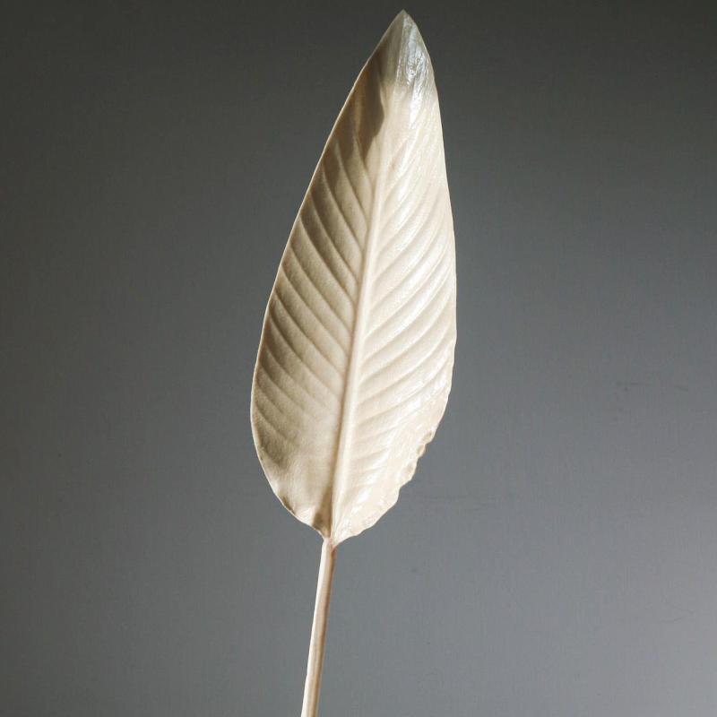 arrow_backTil oversigtenThe Dawn Leaf is both a floral stem and a sculpture, depending on the styling. Beautiful as a stand-alone piece but also works well in a bouquet, adding some edge. The stem is thick, tall, and straight, and the metallic leaf is enlarged, making the design surrealistic and sophisticated.