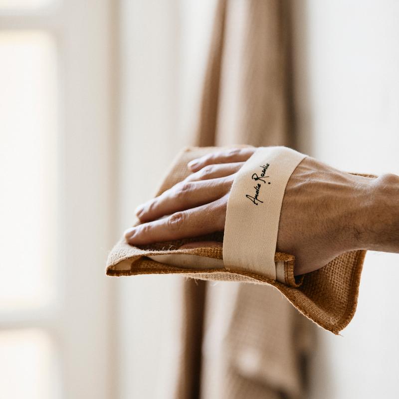 Put sæben i handsken, gør handsken helt våd og vask med cirkulære bevægelser. Skyl efter med vand.