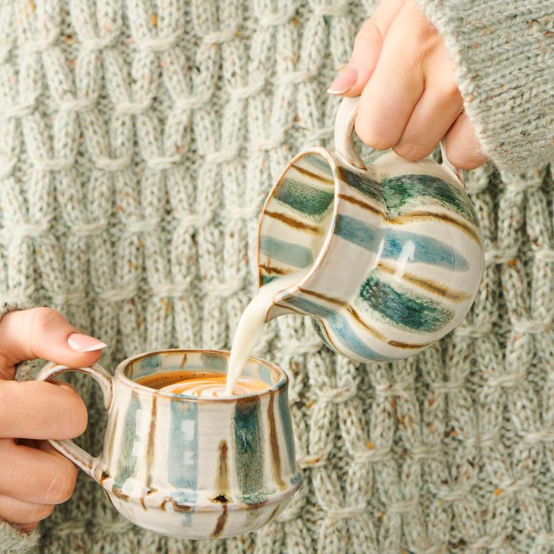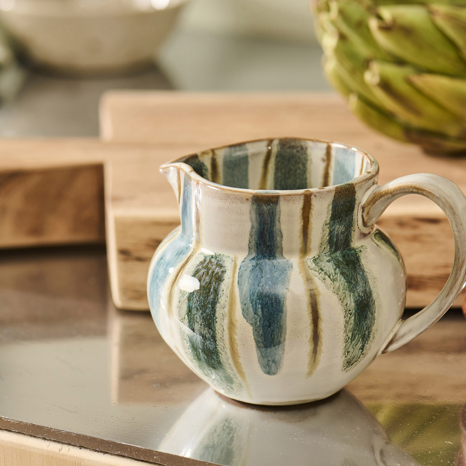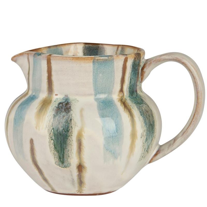 Lille stentøjs kande i vores nye Kalmar-serie, som består af 7 kander og krus. Glasuren prydes af brede støvblå striber og fine brune linjer, som tilsammen giver et håndmalet og unikt udtryk.