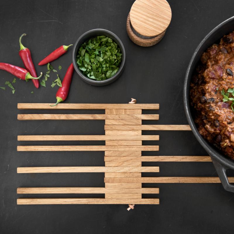 - Table Frame er en smart bordskåner i bæredygtigt egetræ, der let kan foldes ud og bruges til fade og gryder i alle størrelser.