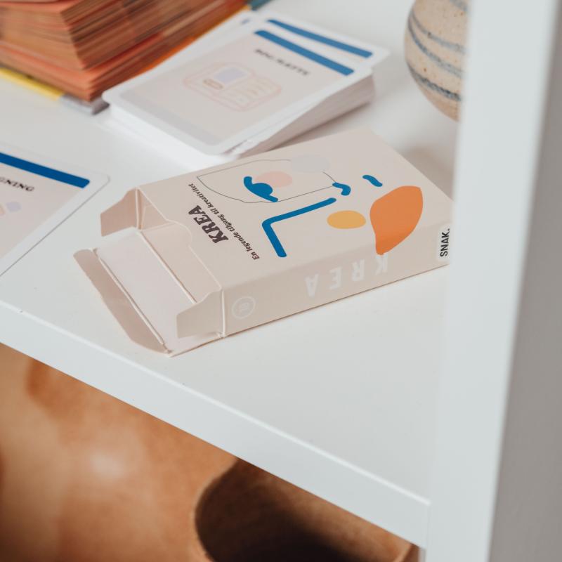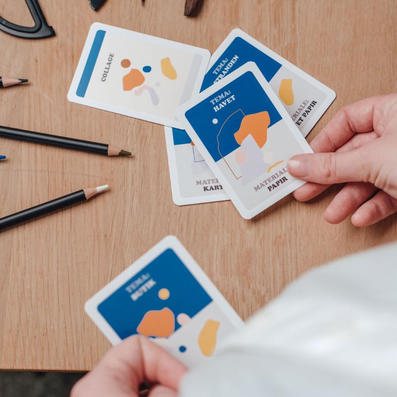 På hvert kort står et tema, et materiale og et kreativt produkt – resten er op til jer. Det er ikke som sådan samtalekort, mere samværdskort, hvor vi er kreative sammen.