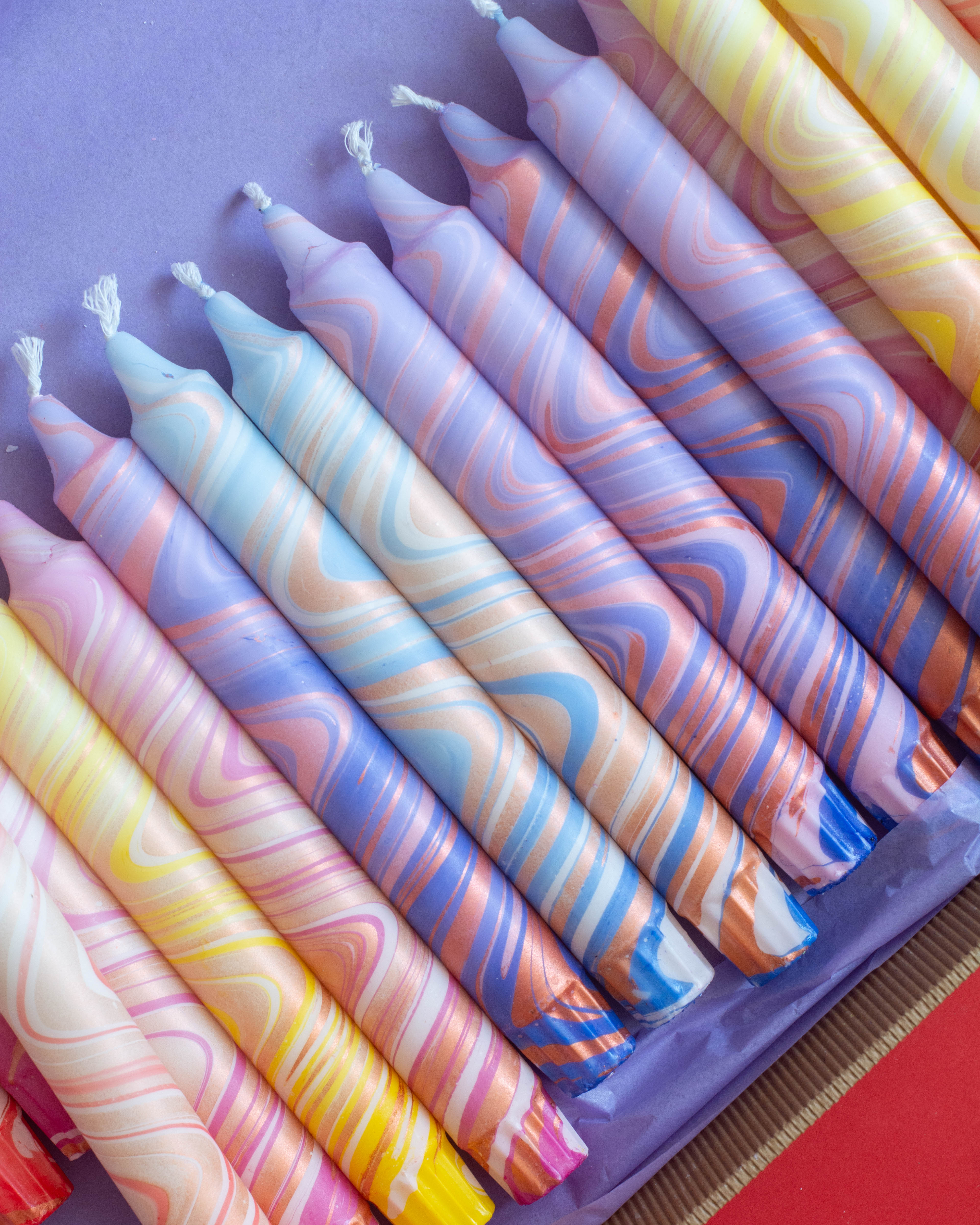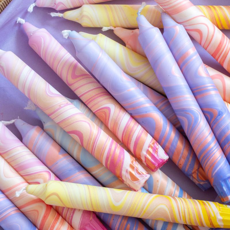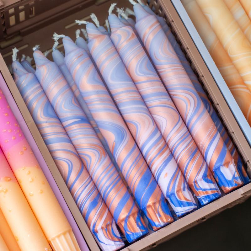 arrow_backTil oversigtenHåndlavede lys i unikke farver, dyppet og dekoreret i stearinvoks.