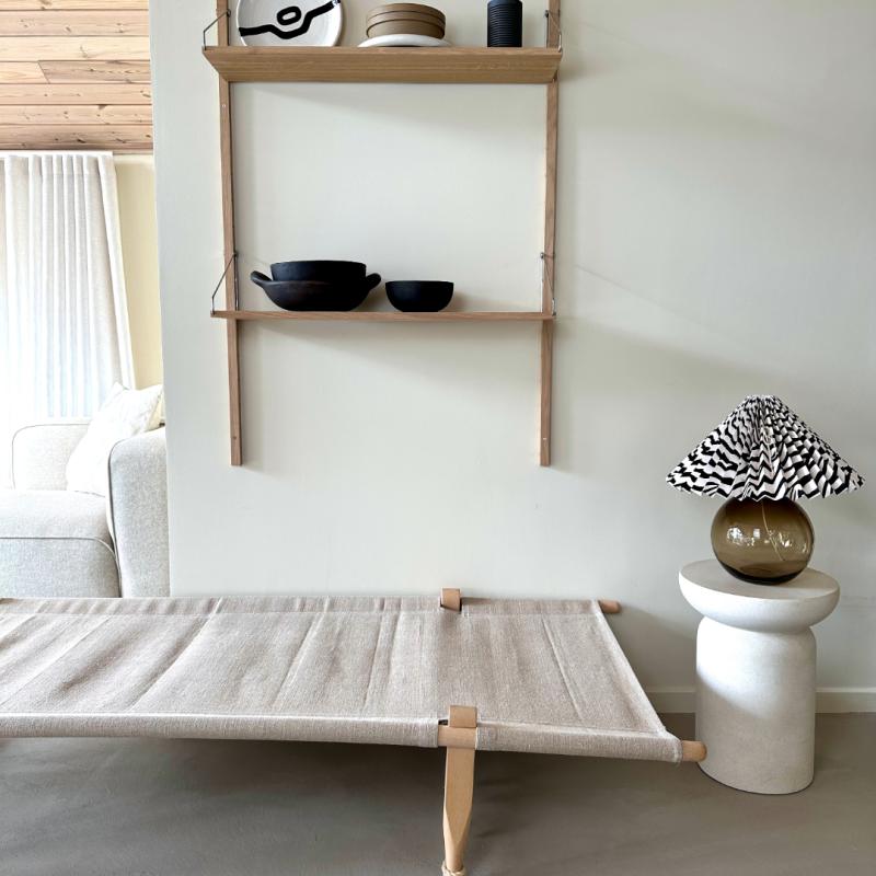 arrow_backTil oversigtenMundblæst lampe i Røgfarvet transparent glas, med en håndlavet plisse lampeskærm i vores Zebra print.
