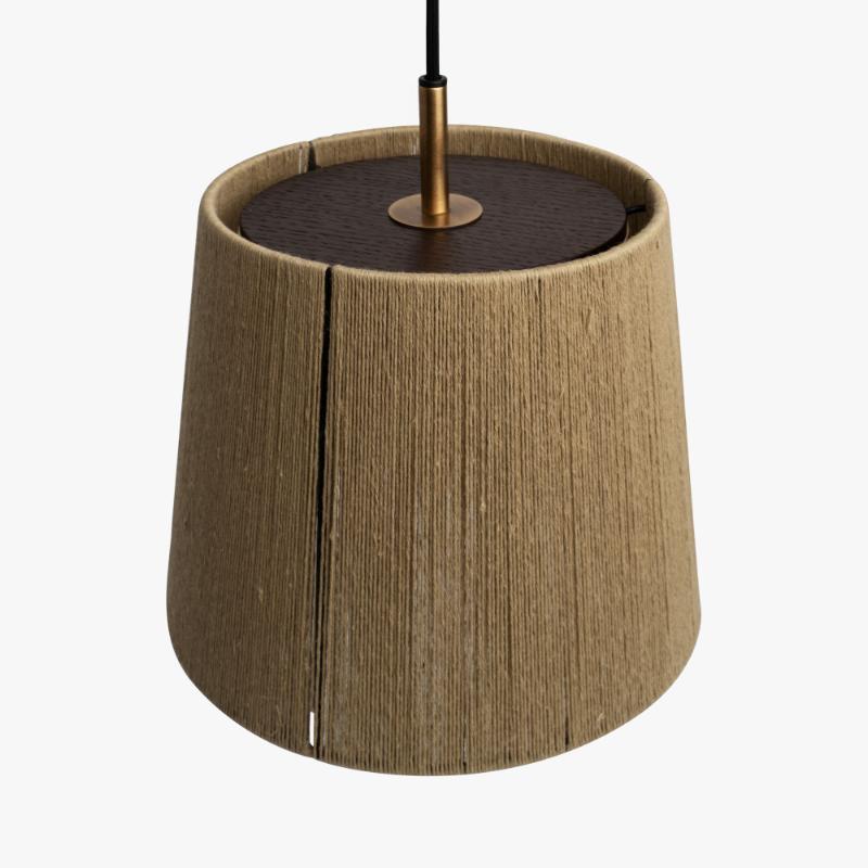 Materialer: Lampen består af en lampeskærm med en metal konstruktion i sort. Lampeskærmen er håndviklet med en eco-friendly vegansk certificeret hør, der er naturfarvet med planteekstrakter. Top pladen er i træ med en oliering i farven røget eg med en lille messingbelagt skive med en diameteren på 4 cm, samt et lille messing rør med ledning.