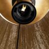 Top pladen i træ har en oliering i farven røget eg med en lille messingbelagt skive på diameteren 4 cm og et lille messingbelagt rør til ledningen. Toppladen har på undersiden en messingbelagt metalplade og fatningshuset er en messingbelagt metal.