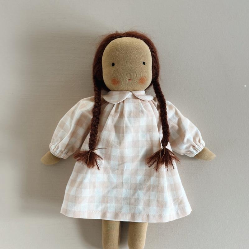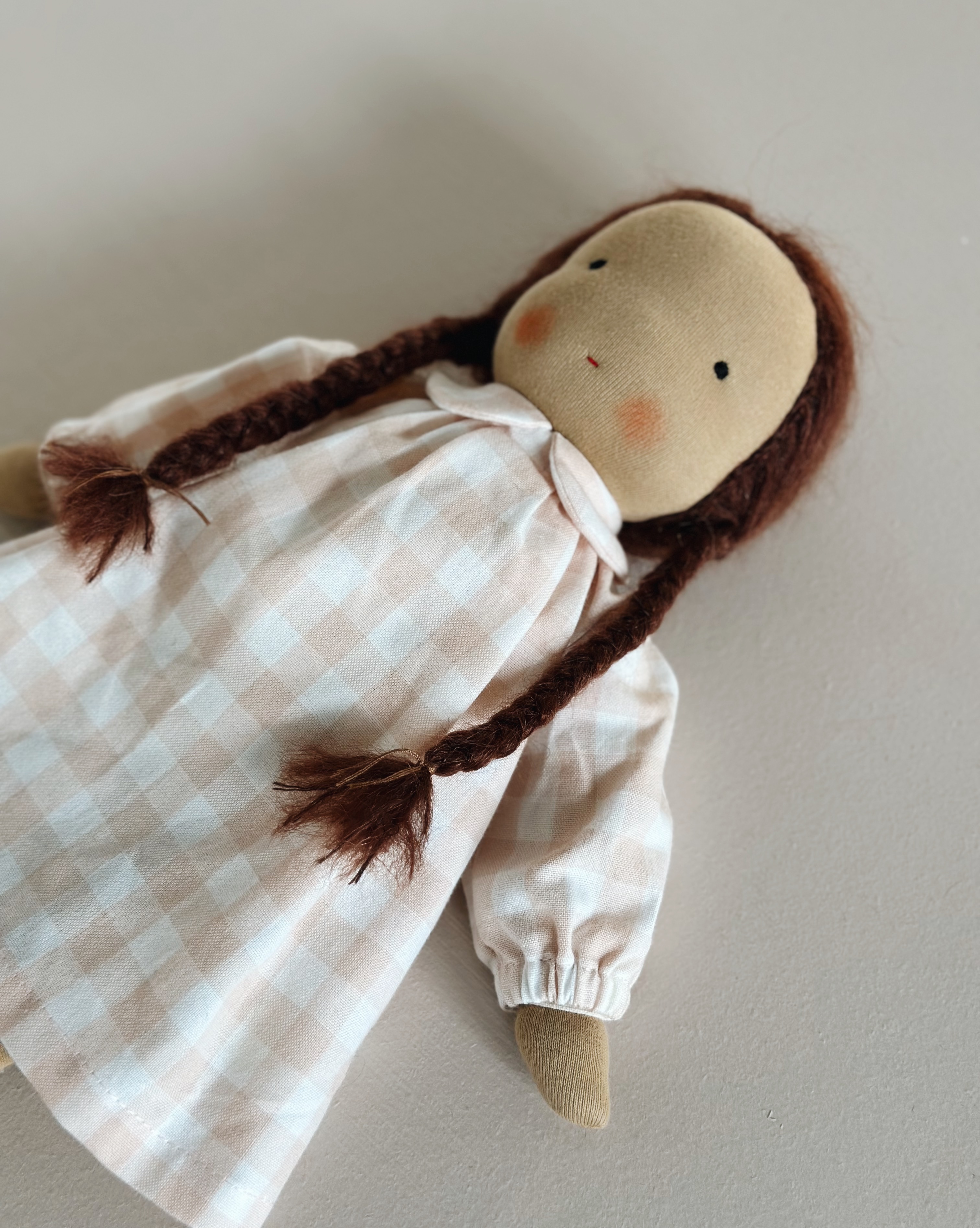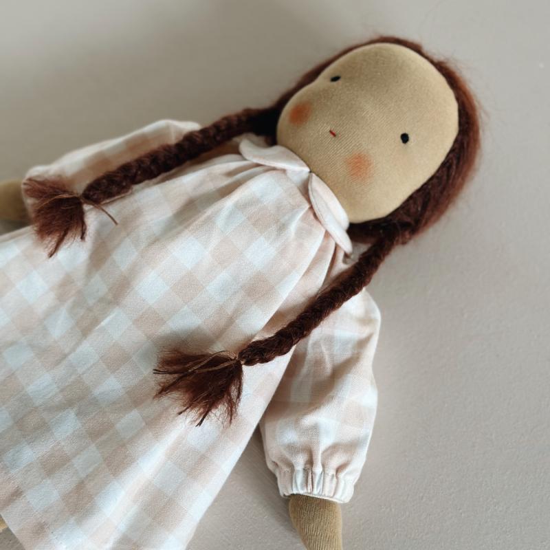 Dukkens krop er lavet af en hør/bomuldsblanding, har påsyet arme og er fyldt med økologisk uld. Kinderne er farvet med en naturlig bivoksfarve.