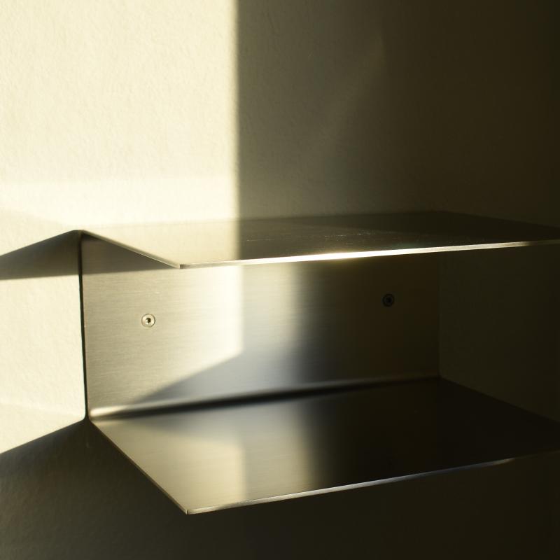 Rustfrit stål er et holdbart og hygiejnisk materiale, som gør LUND til et alsidigt valg for ethvert rum. Bordet kan anvendes til praktisk opbevaring i køkkenet eller på kontoret, som natbord ved sengen eller som et stilfuldt designelement på væggen. Stålet har en børstet finish, så hylden er glat og dermed nem at tørre af og gøre ren.