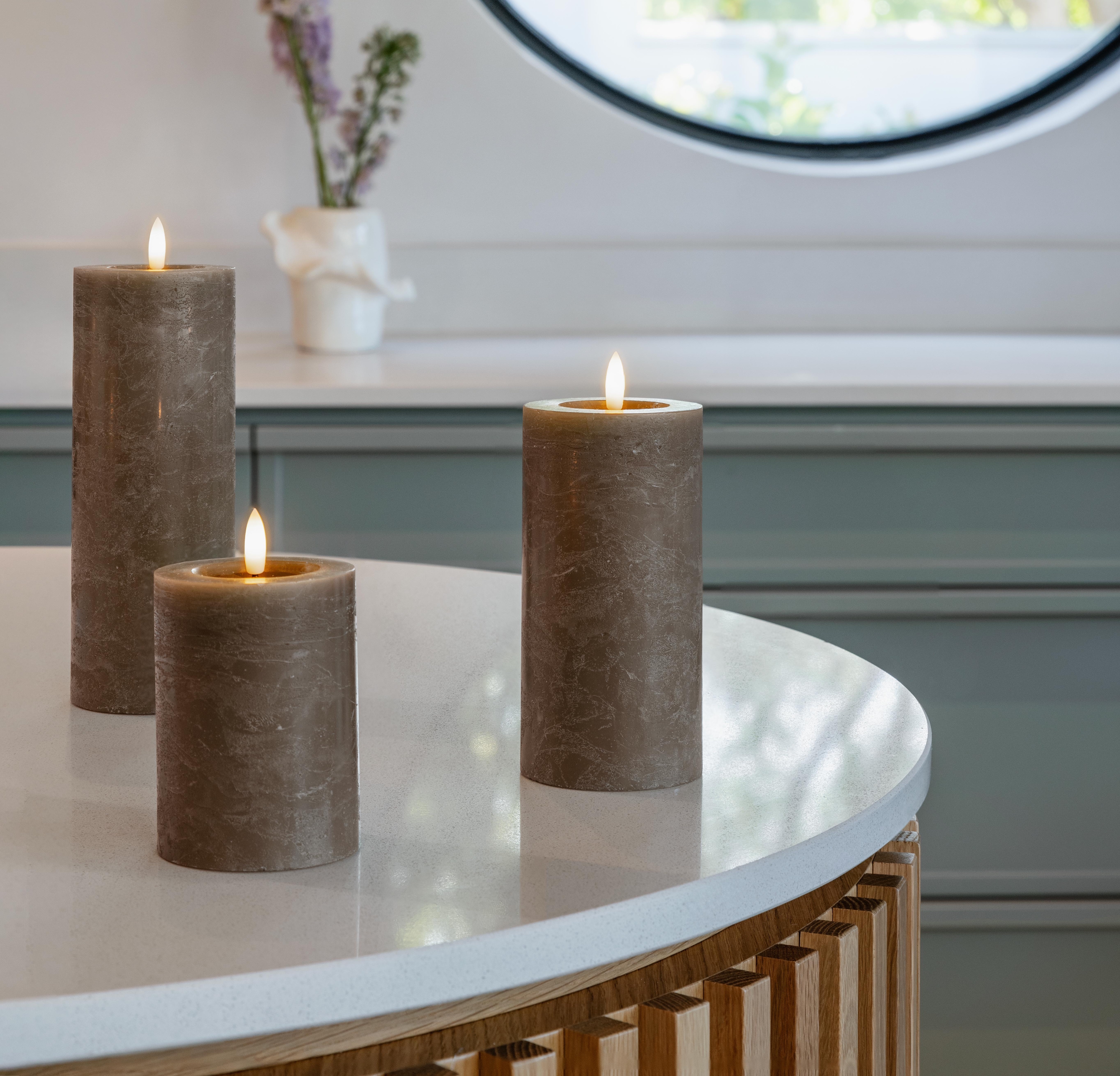 Our LED Melted Pillar Candles are available in a variety of colours, including Classic White, Kit Grey, Sand, Dark Sand, Honey Mustard, Vintage Rose, and Charcoal. Choose from a range of sizes: 74 x 100 mm, 74 x 150 mm, 74 x 200 mm, 99 x 100 mm, 99 x 150 mm, and 99 x 200 mm.