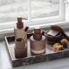 I serien finder du to sæbedispensere, en tumbler og en krukke med låg i farverne valnød og kit.