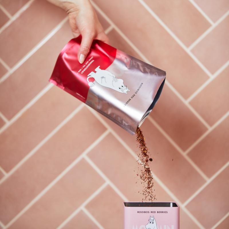 FIndes både med løs te i tin dåser, pyramideposer i æske og en pouch med løs te der kan bruges som refill.