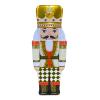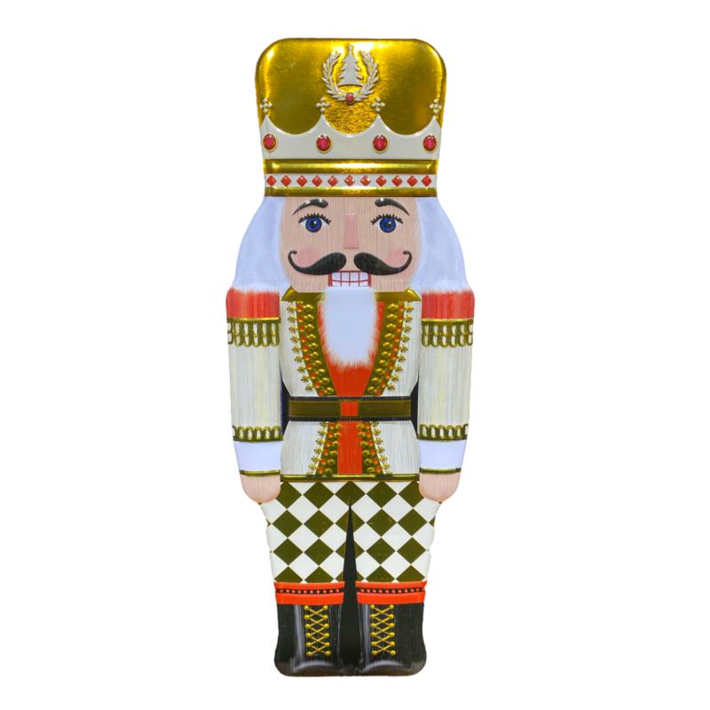 Nøddeknækkeren står rank i sin fine uniform, hvor bukserne er hvid og guld ternet, jakken hvid, hråhvid, med rød og guld pynt på skuldrene, samt guldknapper mm.