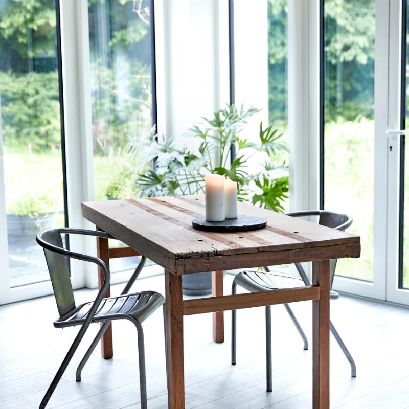 Vi har brugt den originale bordplade med masser af patina, men har tilført nye bordben lavet af gammelt træ for at sikre bordets stabilitet og højde bordets funktionalitet. Pga. placeringen af bordbenene kan du eller dine gæster sidde komfortabel ved bordenden. Størrelse: L150 cm. D75 cm. og H75 cm.