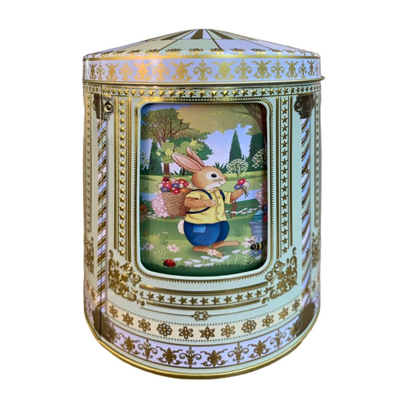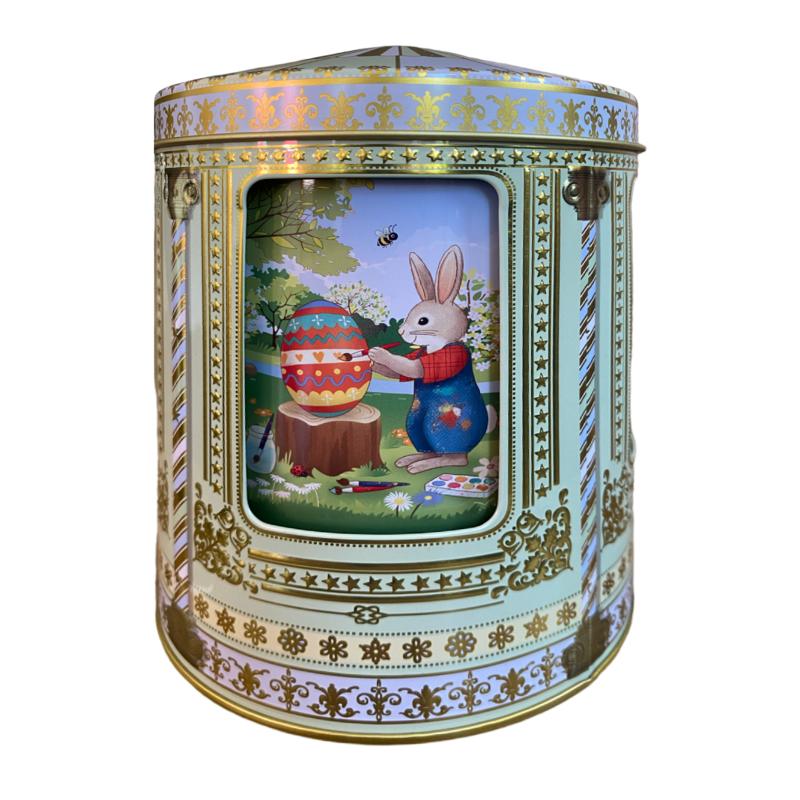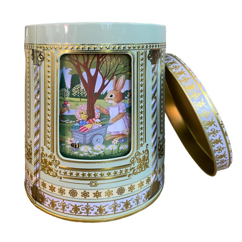 Retro påske kagedåse, der også er en spilledåse med de sødeste påskeharer og påskeæg.