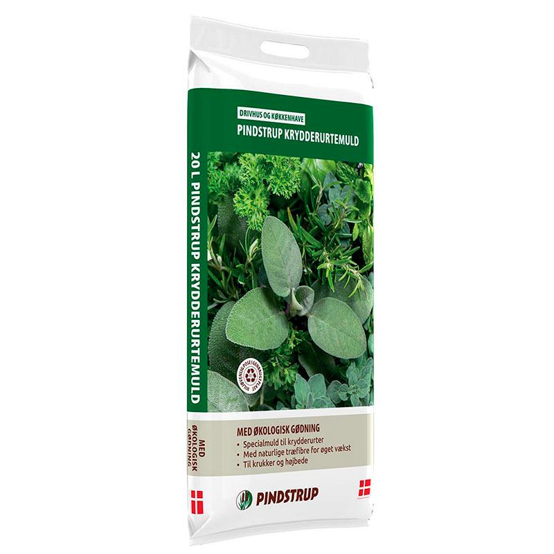 Pindstrup Krydderurtemuld med økologisk gødning fås i 8, 20 og 50 liter